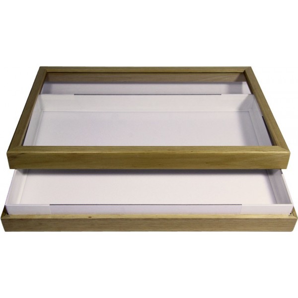 Made in ramin wood, colour natural light. Framed glass cover with hermetic seal. Plastozote bottom white, 10 mm thickness. Height cm. 11.